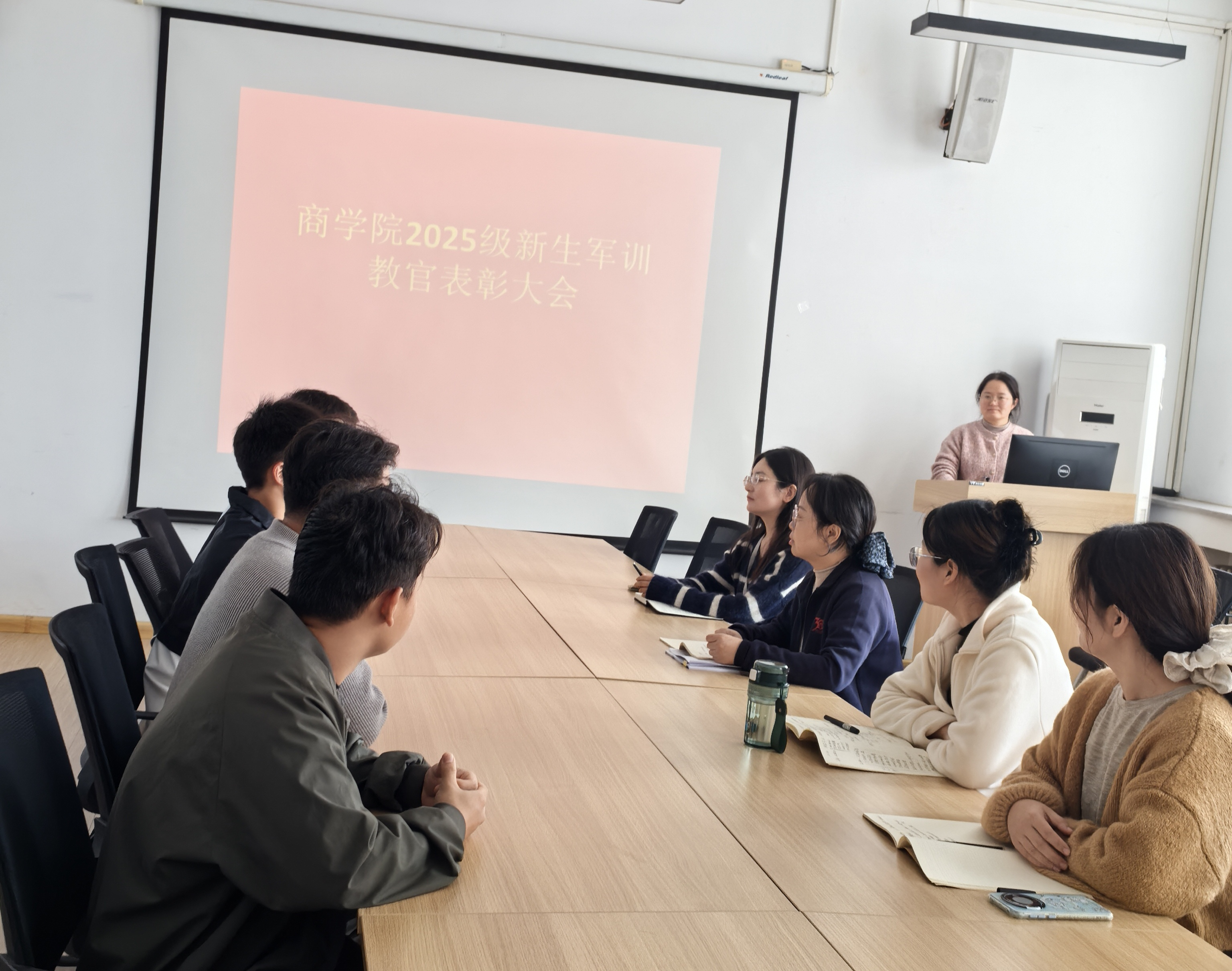 为表彰在2025级新生军训工作中表现突出的教官,弘扬他们吃苦耐劳、严谨负责的奉献精神,10月14日13:30,商学院在教学2号楼315会议室隆重举行军训教官表彰大会。商学院党委副书记郗艳花、团委副书记张艺培、征兵专员刘琳琳、辅导员曹佳丽和李培以及宋征军、崔长宇等六位新生军训教官共同出席了本次大会。