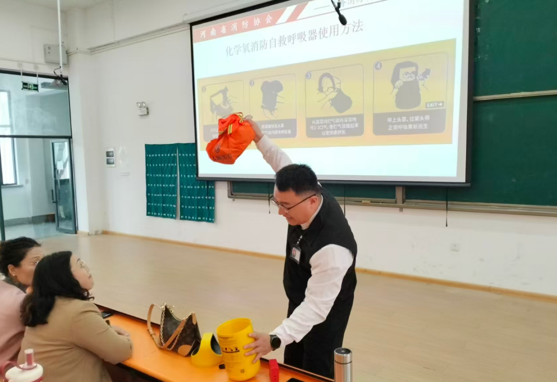 培训中,李教官结合日常生活中常见的用气、用电等典型火灾案例,以真实场景还原的方式,剖析了因消防安全意识薄弱、初期火灾处置不当引发的严重后果,让在场师生深受触动。同时李教官还列举了违规使用大功率电器、私拉乱接电线等操作的危害性,详细讲解了如何进行日常检查和防范。他还现场演示了干粉灭火器的正确操作步骤、逃生面罩的佩戴要领,以及火灾发生时如何利用疏散通道、逃生绳等工具快速自救。