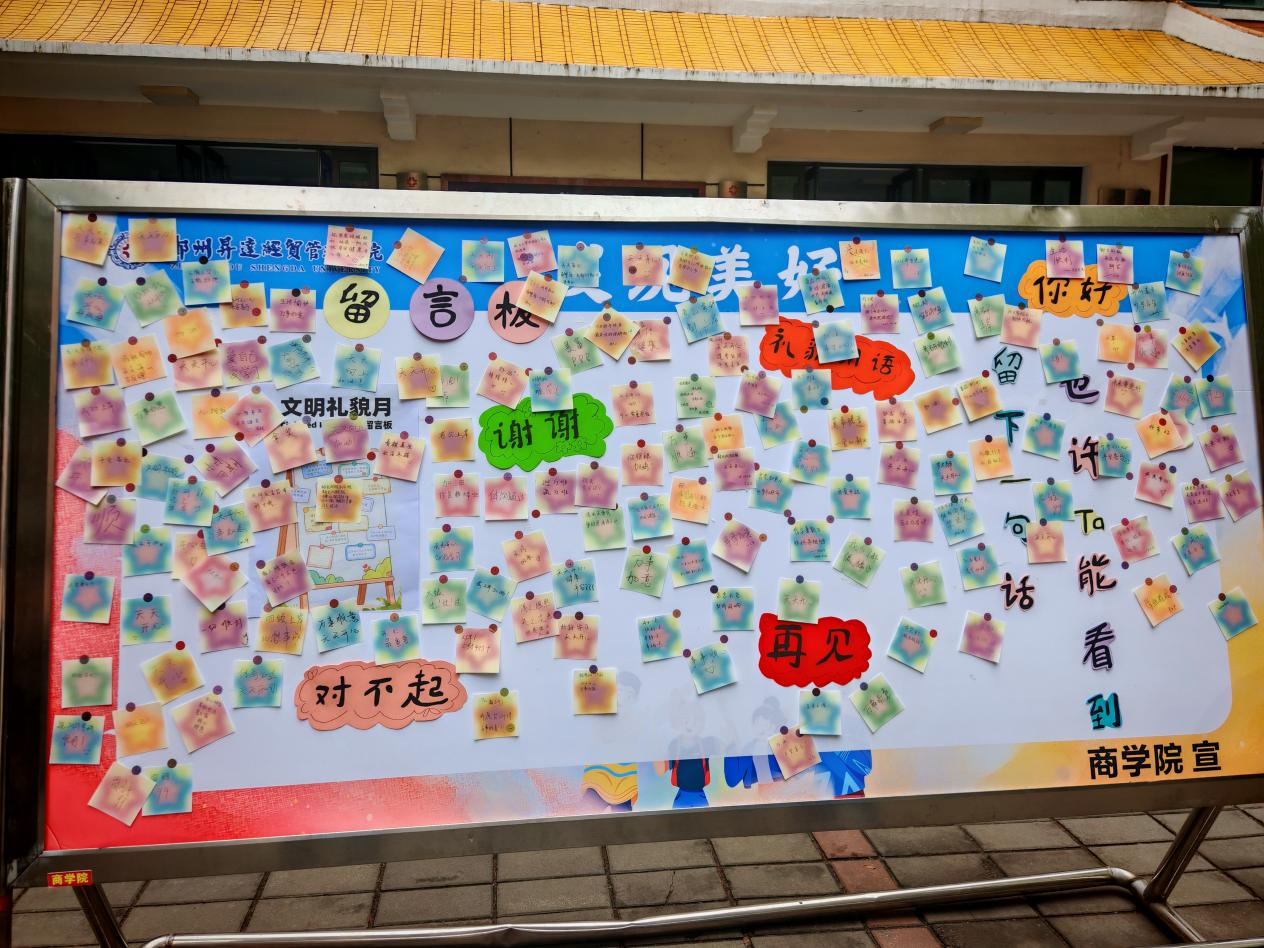 为营造文明有礼的校园氛围,商学院还特别推出“礼润校园,言暖你我”留言板活动。活动现场,同学们热情高涨,纷纷拿起便签,有的写下自己被他人礼貌对待的温馨瞬间,字里行间满是感动;有的认真写下想传递的礼貌倡议,真诚且有力。随后,大家将便签郑重贴上,让文明之花在校园绚烂绽放。