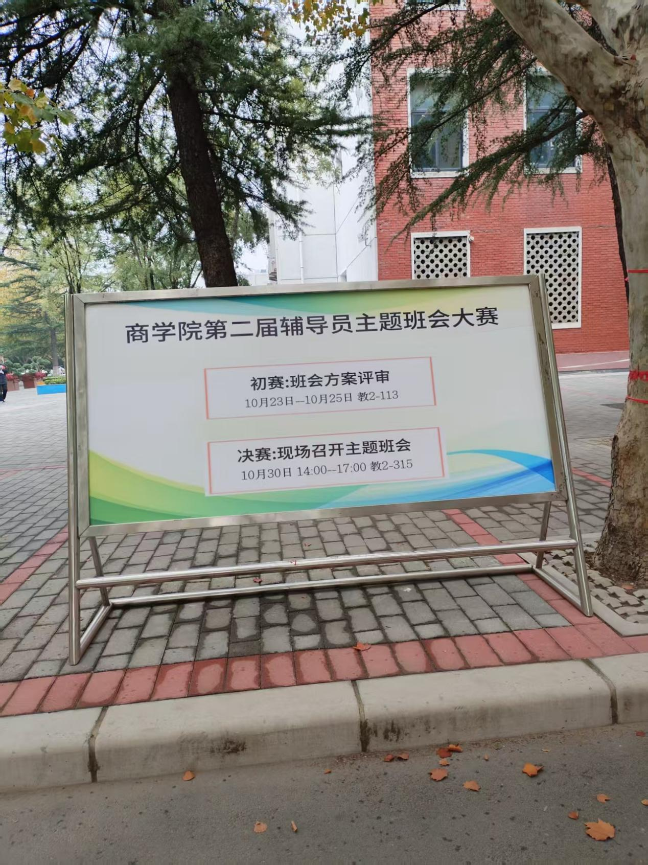 目前,大赛前期宣传工作已全面启动并有序推进。主题鲜明的宣传条幅悬挂于商学院门口,其门前道路一旁则布置了系列专题展板,图文并茂地展示了大赛的背景、赛程与精彩瞬间,引得往来师生频频驻足。宣传内容紧扣“学业规划启新程”与“爱国教育铸魂人”两大主题,着力突出辅导员在学生思想引导、学业发展和成长服务中的关键作用。整体宣传旨在营造全员关注、共同参与的良好氛围,为大赛的顺利举办预热蓄力,进一步强化育人合力。