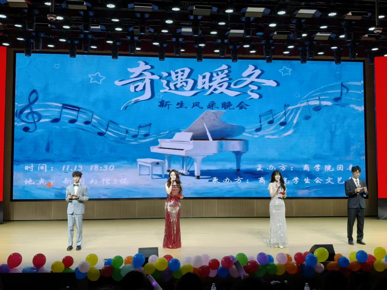 为激发学生的艺术潜能与创新精神,搭建一个展示自我、锻炼能力的实践平台,商学院于2025年11月13日在新图书馆3楼报告厅举办了主题为“奇遇暖冬”的迎新晚会。商学院团委副书记张艺培,辅导员李培、朱蒙蒙、曹佳丽,校学生会、校社团管理部代表、各院主席团以及2025级新生共同参与此次晚会。本次活动由商学院团委学生会文艺部承办。