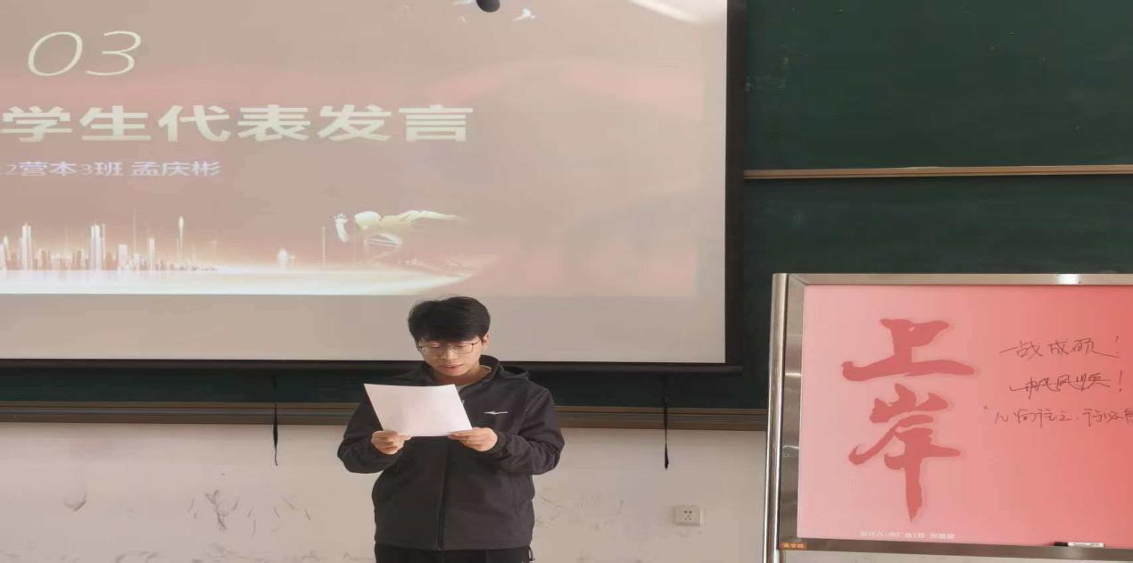 接下来,关老师播放了由已成功“上岸”的往届学生代表录制的经验分享视频。视频中,学长学姐结合亲身经历,围绕复习规划、心态调整与应试技巧等方面倾囊相授,以“星光不负赶路人”的信念鼓舞在场学子,提供了切实可行的经验参考。视频结束后,2026届考研学生代表孟庆彬登台发言。他回顾了从决定考研到全力冲刺的心路历程,由衷感谢学院的暖心关怀,并表示将以更加坚定的姿态投入后续复习,不负学院与师长的殷切期望。真挚的讲述引发了现场强烈共鸣,掌声频频响起。