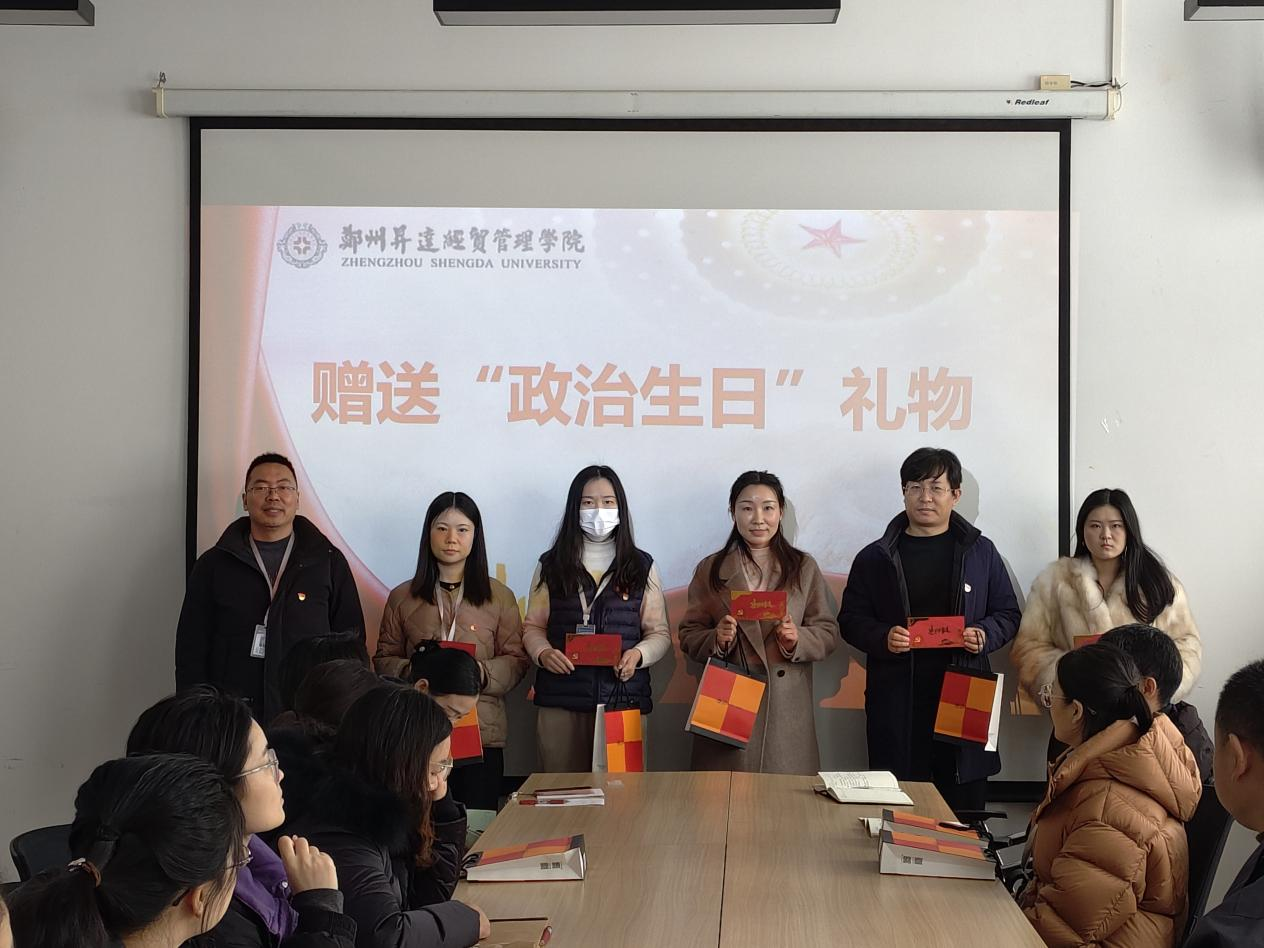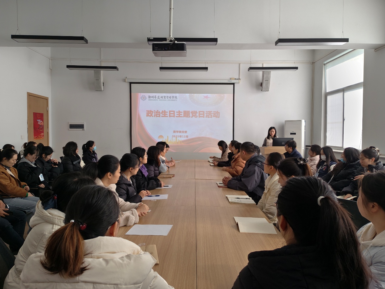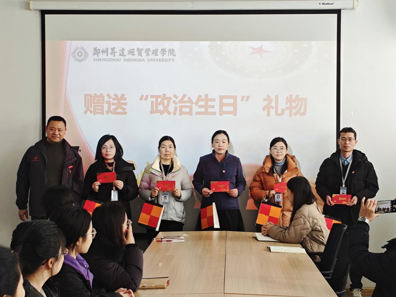 为筑牢党员理想信念根基,强化党员身份认同与组织归属感。2025年12月18日,商学院党委在教学楼2号楼会议室开展集体“政治生日”主题党日活动。通过齐唱《国际歌》、重温入党誓词、赠送“政治生日”礼物等环节,为党员们开展一场深刻的党性教育。