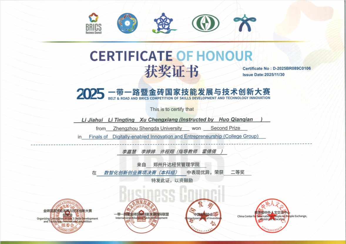 本项赛事由金砖国家工商理事会中方理事会、一带一路暨金砖国家技能发展国际联盟及教育部中外人文交流中心联合主办,为《2024全国普通高校大学生竞赛分析报告》目录内赛事,权威性高、影响力广,旨在促进数智化技术与教育的深度融合,实现应用型人才培养和产业岗位需求有效衔接。大赛自7月启动,学院积极组织学生参加,两支队伍历经校赛、区域赛及全国总决赛第一阶段的层层选拔,最终以前30%的排名晋级第二阶段决赛,并以优异表现锁定胜局。