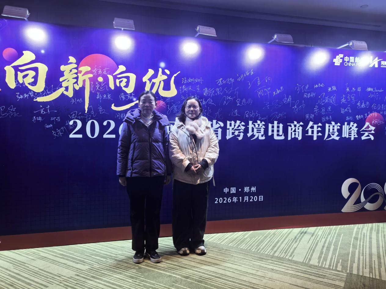 1月20日,由河南省跨境电子商务协会联合中国邮政河南省分公司主办的“2026年河南省跨境电商年度峰会”在郑州建业艾美酒店盛大举行。本次峰会以“向新・向优”为主题,汇聚了政府领导、行业专家、平台代表及跨境电商从业者,共同探讨行业发展新趋势。商学院跨境电子商务教研室主任常春燕及专业教师马绍华参会,全程参与行业交流与发展研讨,为专业建设与行业资源对接汲取前沿思路。