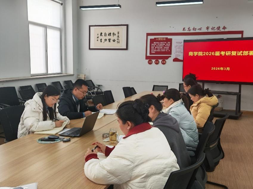 为切实做好2026届毕业生考研复试指导工作,提升学生升学竞争力,商学院于2026年3月10日在学院会议室召开了2026届考研复试专题部署会。学院院长白朋飞、教学秘书马巧丽、各教研室主任及考研专员老师共同参加会议,会议由院长主持。