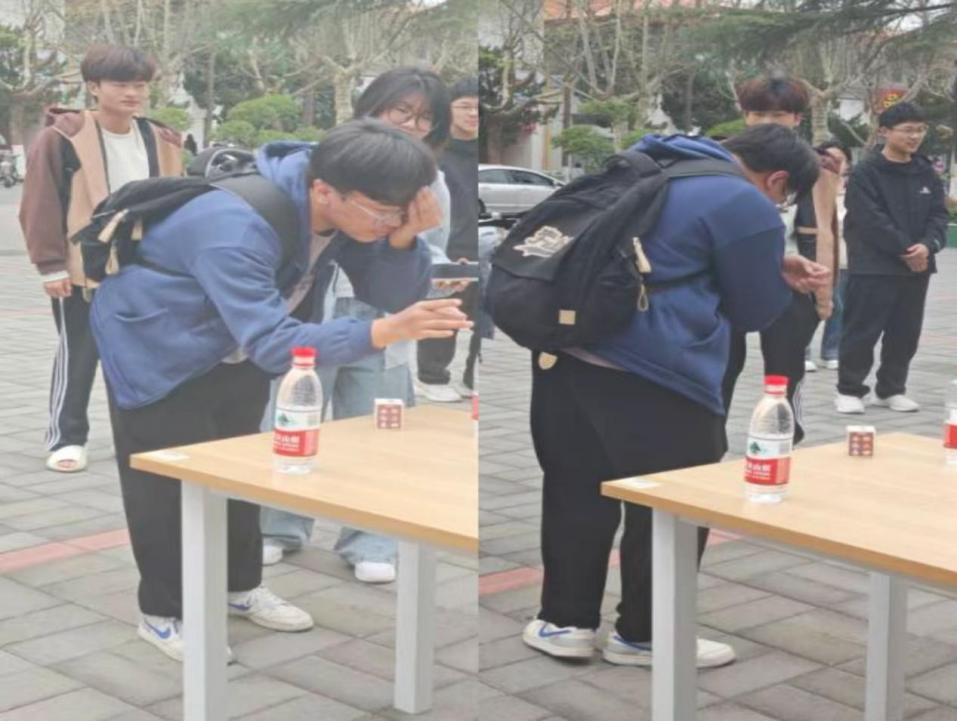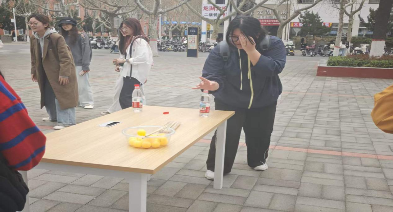 游戏规则简洁而富有挑战:参与者单手蒙眼,在起始线后原地快速旋转3圈,待站稳后凭借身体平衡感和方向感走向目标水瓶,伸出手指精准弹开倒扣在瓶口的瓶盖,每人拥有两次尝试机会,成功完成挑战即可领取精美小礼品。看似简单的动作,在旋转后却变得难度倍增,不少同学转完后脚步踉跄、方向难辨,小心翼翼摸索前行的模样引得围观师生阵阵欢笑;也有同学稳住心神,屏气凝神,用指尖蓄力一击,精准弹开瓶盖,瞬间收获周围的欢呼与掌声。这不仅是身体平衡与反应力的较量,更是心理状态的即时博弈。周围同学时而为紧张的步伐屏息凝神,时而为精彩的操作鼓掌叫好,现场互动感十足。无论是成功后的喜悦,还是失误后的释然,大家都沉浸在这份轻松趣味中,平日里学习的压力与疲惫在欢声笑语中尽数消散,校园广场上处处洋溢着青春朝气,热闹非凡。