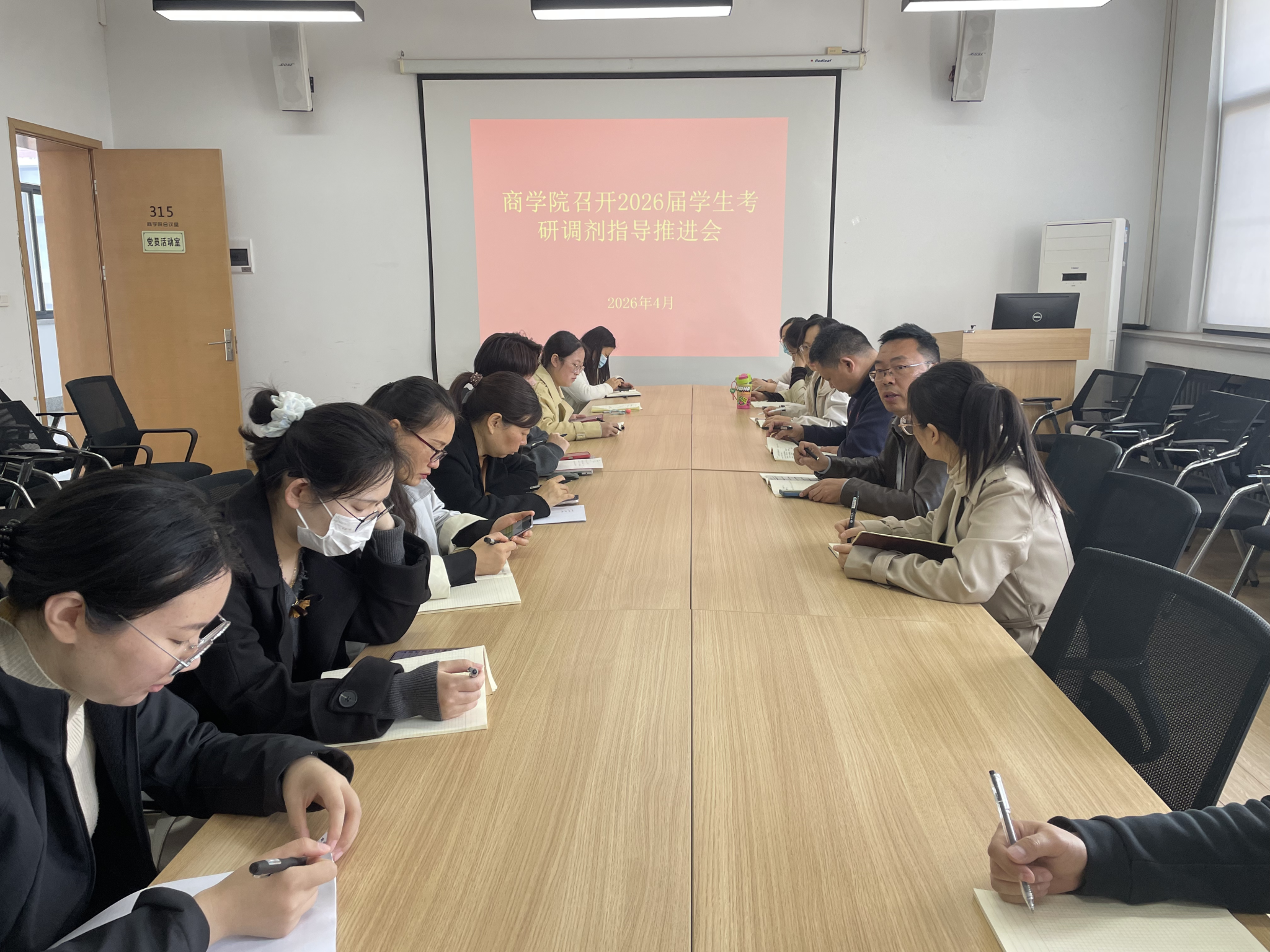 为深入推进毕业生升学指导工作,精准服务考研学子成功上岸。4月9日上午,商学院在教学2号楼315会议室召开2026届学生考研调剂指导推进会。商学院院长白朋飞、党委书记郭峰、教学秘书马巧丽、党委副书记郗艳花、26届本科辅导员及各教研室主任参加了此次会议,会议由白院长主持。