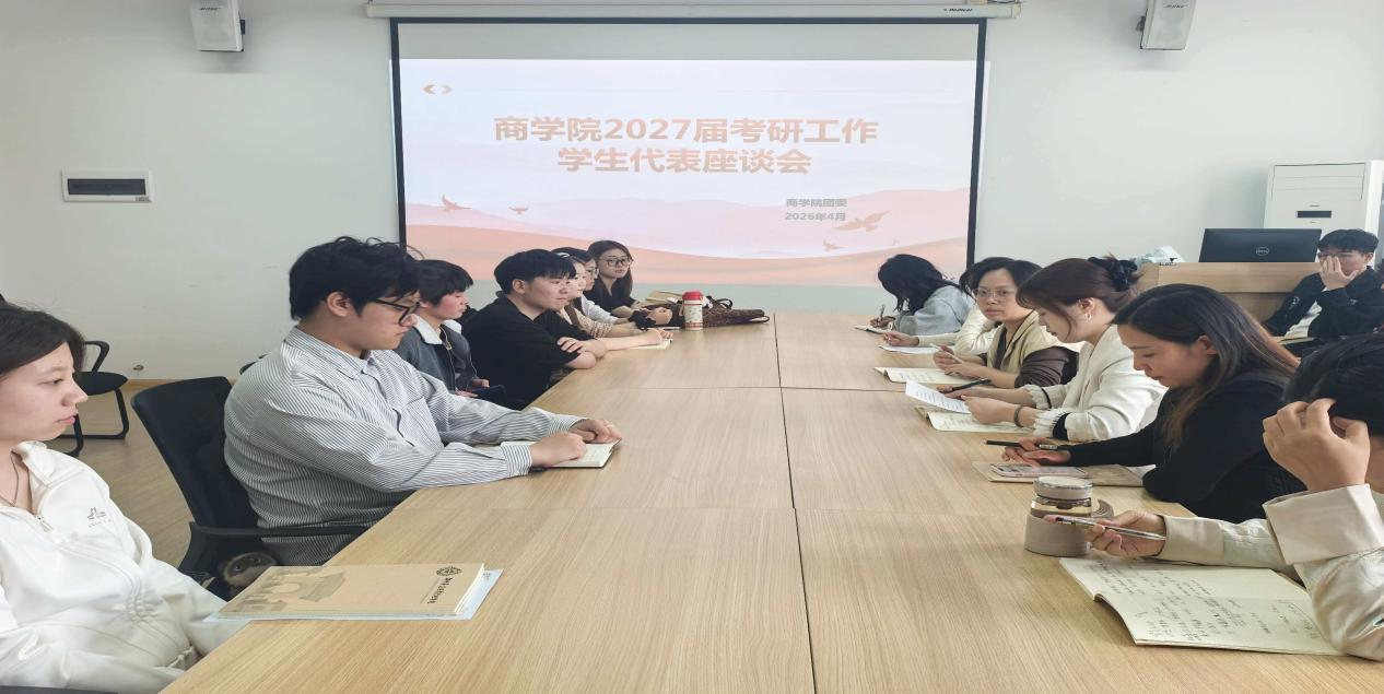 为深入研判考研新形势、精准对接学子备考需求、全面优化考研服务保障体系,切实助力2027届考研学子科学备考、成功上岸,商学院于2026年4月13日在教学楼2号楼315教室召开“我为同学做实事”——2027届考研工作学生代表座谈会。商学院党委副书记郗艳花,26、27届本科毕业班辅导员以及2027届各班学生代表共同参加。本次座谈会由商学院团委学生会学习部承办。