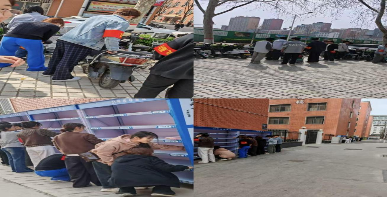 随后,活动进入实践环节,各小组前往指定区域开展服务。在学校生活馆周边,团员们主动将乱停乱放的非机动车逐一摆放整齐,规范校园通行秩序,为师生营造安全、整洁、有序的出行环境。在19、20、21、22号宿舍楼前,团员们手持抹布等工具,对取餐柜进行全面清洁整理,认真擦拭柜体灰尘、清理边角垃圾,消除卫生死角,让取餐环境更加干净便利。活动过程中,大家分工协作、不怕脏不怕累,以饱满热情投入服务,用实际行动诠释雷锋精神的时代内涵。