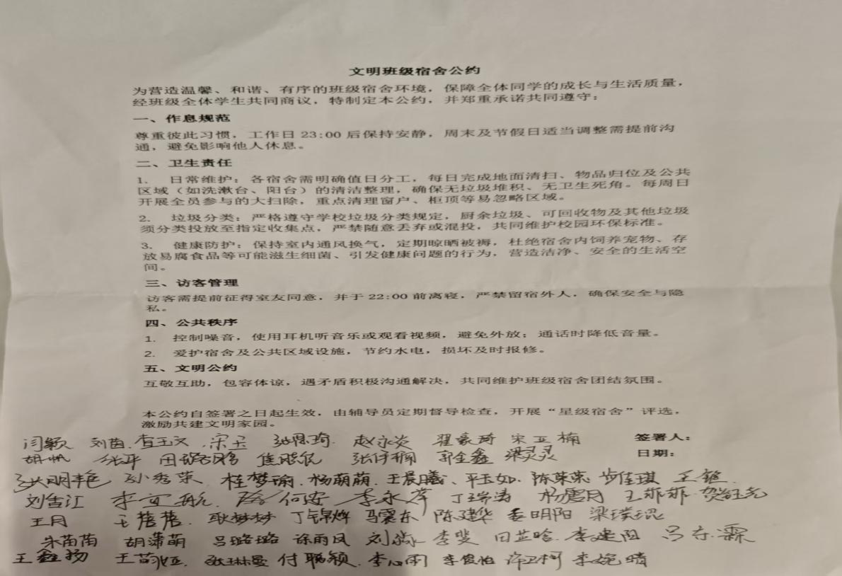 公约护航整洁有序,共建温馨文明宿舍。为营造舒适和谐的住宿环境,25物升本2班组织全体同学共同签订文明班级宿舍公约,从作息规范、卫生责任、公共秩序、文明相处等方面作出明确约定,倡导23:00后安静作息、节约水电、爱护公物。各宿舍严格落实值日制度,定期开展卫生大扫除,做好垃圾分类,保持通风整洁。以公约促自律,以评比促提升,推动宿舍环境干净整洁、室友关系和睦融洽,构筑温馨文明的住宿阵地。
