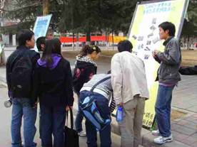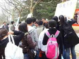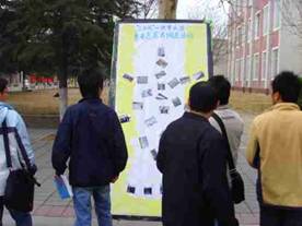 3)活动宣传。为了向大家展示调查成果,向大家宣传水资源的保护,他们制作了3张展板,并于3月21日开始展出。三张展板,主题各异:一张向大家介绍世界水日和保护水资源的重要性;另一张则粘贴他们的实践照片,并由组长丁志浩为观看的同学做简单的讲解,此举收到了意想不到的效果,甚至有很多的同学主动要求他们再组织这样的活动。在另外一张志愿者签名展板上,他们于上午第二节下课摆出后,中午时分,短短的时间内上面就写满了来自不同系班的同学,老师甚至包括我校外教的名字。