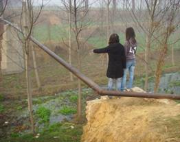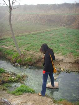 1)“水危机就在身边!”。 2008年3月14日,在班长丁志浩的带领下,07级电子商务专科班团支部调查小组来到的河南省长葛市后河镇白寨村对其水污染情况进行了初步调查。队员在一天时间内徒步行走10多公里,对五彩河(当地俗称“小洪河”)污染段进行了实地察看,同学进行近距离接触,更深刻的体会到水污染的严重性和危害性,如图: